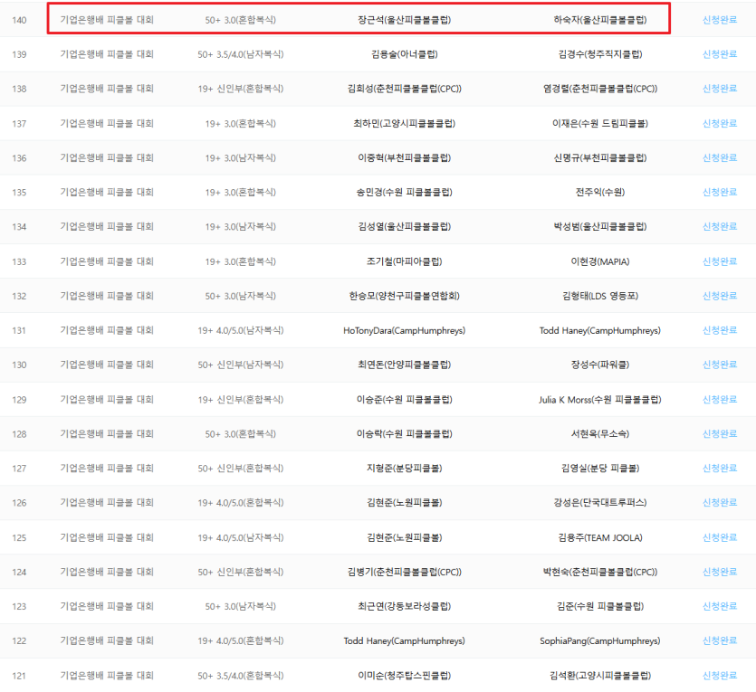 140 | 장근석 | 울산피클볼클럽 | 하숙자 | 울산피클볼클럽 |